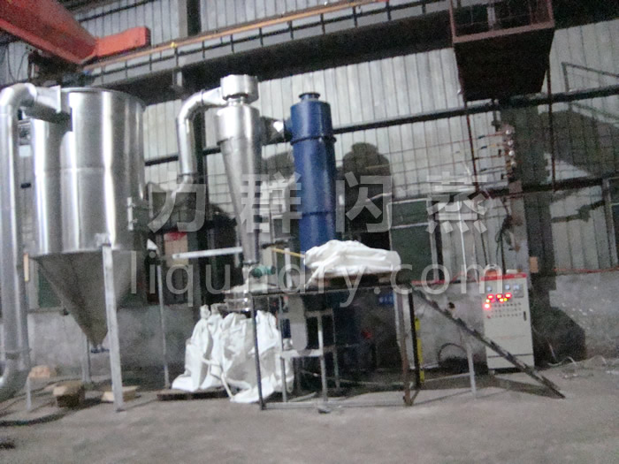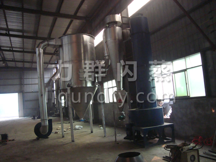 2、工作原理: 经换热器加热后的洁净空气被鼓入进风口,以适宜的速度旋入干燥室底部的环隙,然后按切线方向进入干燥室,并呈螺旋状上升:同时,物料则由可无级调速的加料器定量加入塔内。在干燥塔内,物料与热空气进行充分、高效的质热变换,被干燥的粉状物料随同热风一起输送至分离器,其中成品收集包装,而尾气则进一步经除尘装置处理后排空。